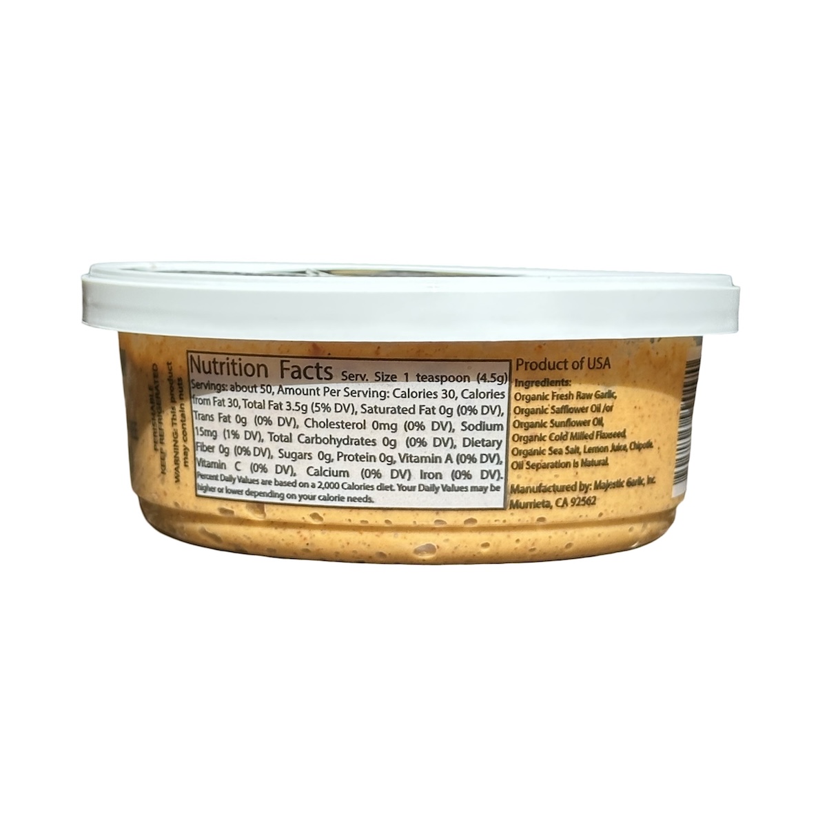 Raw Garlic, Organic Safflower Oil OR High Oleic Safflower Oil, Organic Cold Milled Flaxseed, Sea Salt, Lemon Juice, Chipotle