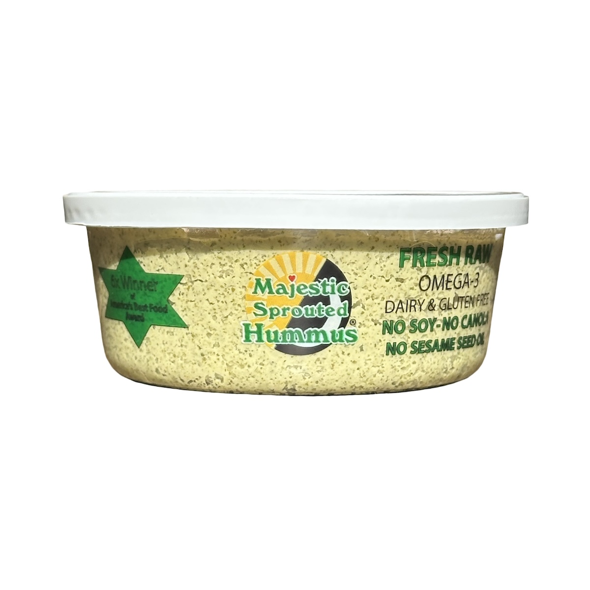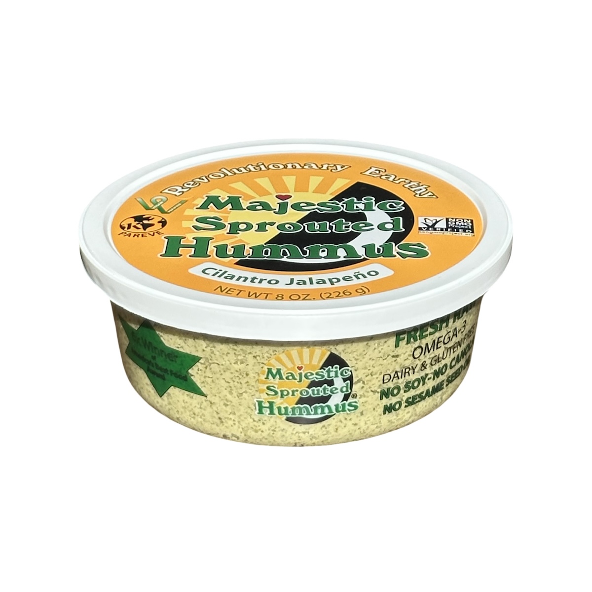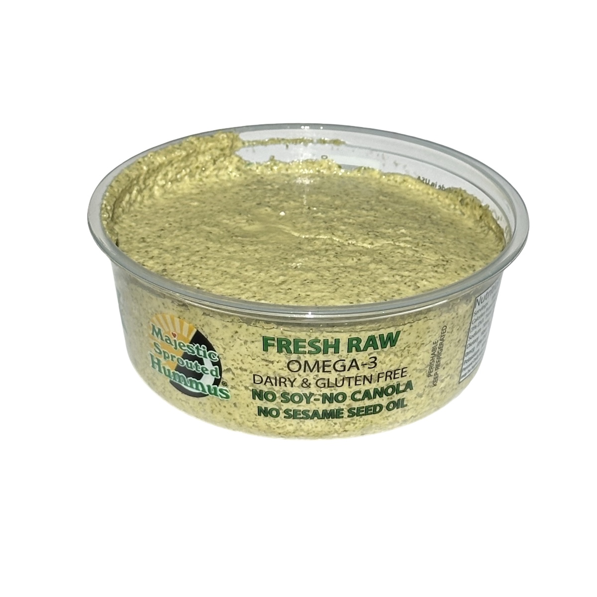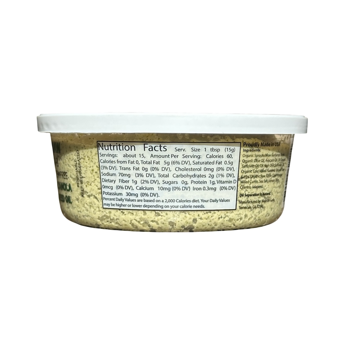 Organic Sprouted Raw Garbanzo Beans, Organic Olive Oil, Avocado Oil, OR Organic Safflower Oil, OR High Oleic Safflower Oil, Organic Cold Milled Flaxseed, Organic Raw Garlic, Organic Raw Apple Cider Vinegar, Milled Cumin, Sea Salt, Lemon Juice, Cilantro, Jalapeno