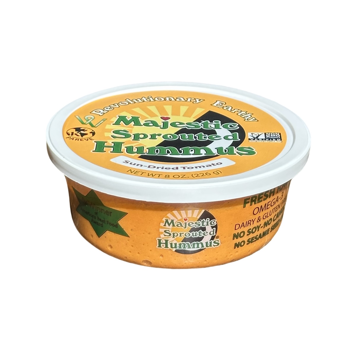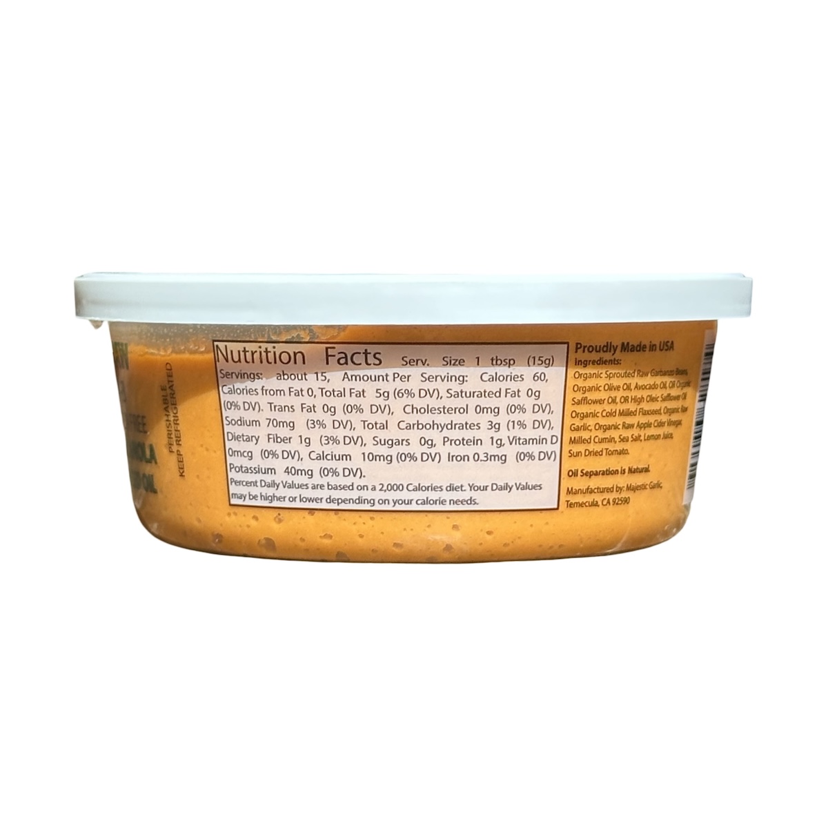 Organic Sprouted Raw Garbanzo Beans, Organic Olive Oil, Avocado Oil, OR Organic Safflower Oil, OR High Oleic Safflower Oil, Organic Cold Milled Flaxseed, Organic Raw Garlic, Organic Raw Apple Cider Vinegar, Milled Cumin, Sea Salt, Lemon Juice, Sun-Dried Tomato