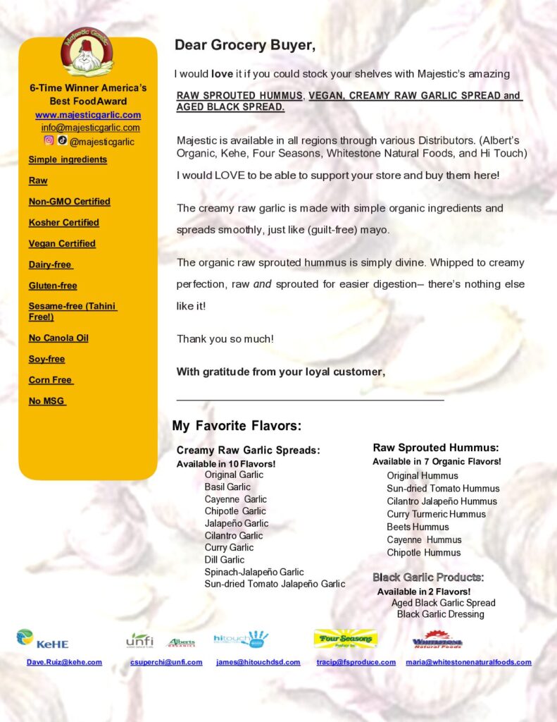 Simply click on and print this form. Please fill it out (checking off your favorite majestic products) and sign your name. Then take it to your favorite grocery store the next time you go shopping. Make sure you give it to the manager or a grocery buyer. Ask for them at the Customer Service desk. (They will know who to ask).